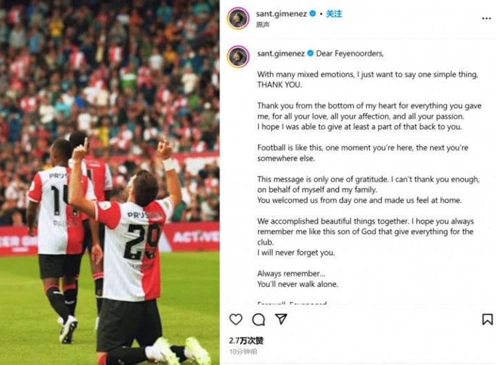 “一如既往体育集锦,你长久不会独行。邂逅费耶诺德,我会把你们长久提神在心。爱你们的,圣地亚哥。”