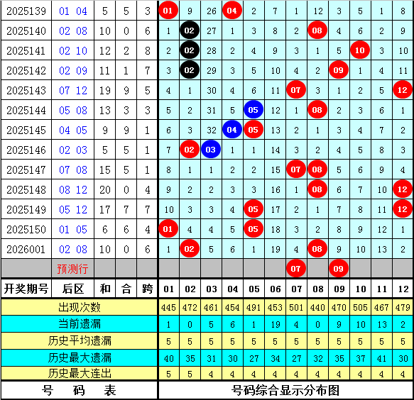 石浩第2026002期大乐透后鉴别析:后区上周星期一后区奖号为05和12,上期开出奖号02和08,最近9周星期一与最近9期后区奖号奇偶比分别为9:9和8:10,大小比分别为12:6和9:9,本期后区谛视全大组合,参考号码07、09、11、12。