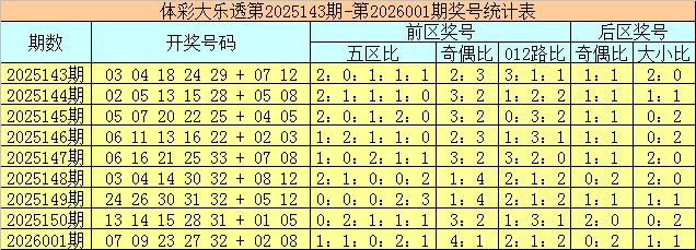 体彩大乐透第2026001期奖号为07 09 23 27 32 + 02 08,前区号码五区比为1:1:0:2:1,奇偶比为4:1,012路比为2:1:2,后区号码奇偶比为0:2,大小比为1:1。