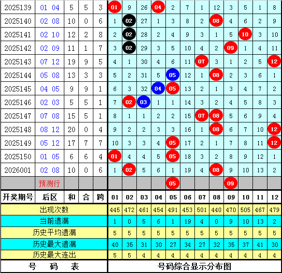 后区判断:上期后区奖号为02和08,开出温码+热码组合。最近十期后区开出11个热码、6个温码和3个冷码,本期预测奖号存眷热码+温码组合,参考两码05、09。