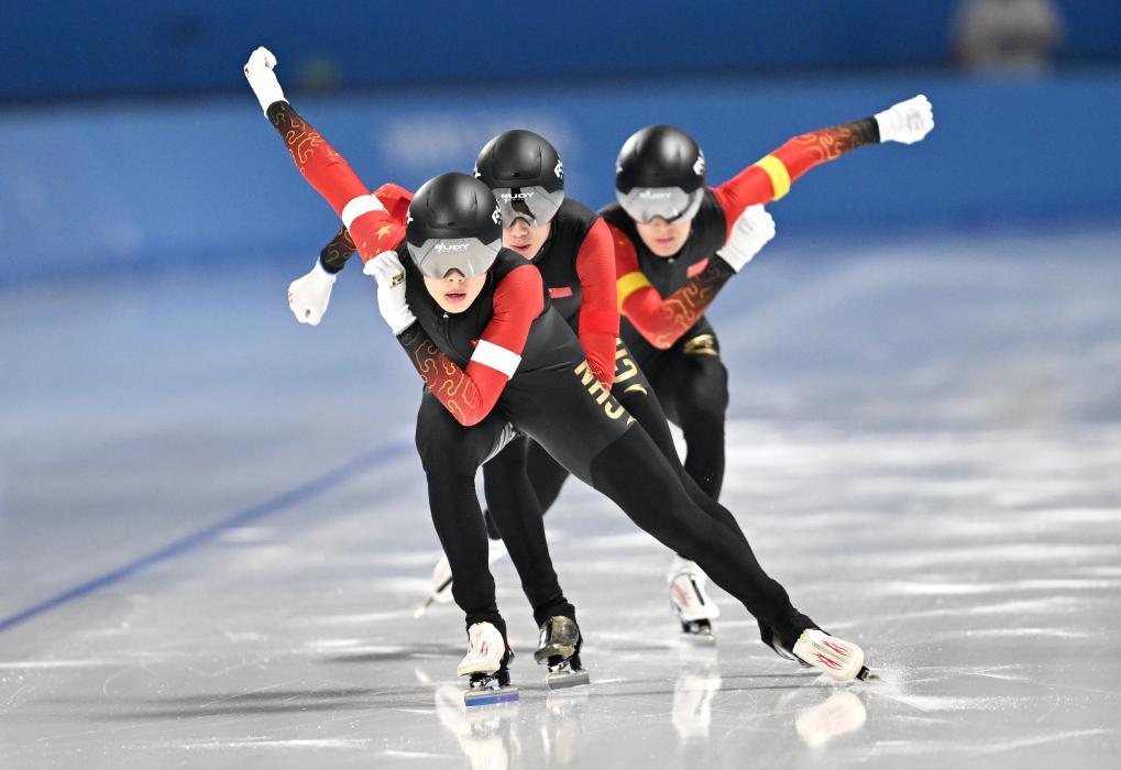 中国队选手刘瀚彬、吴宇、哈那哈提·木哈买提(从前到后)在亚冬会速率溜冰须眉团体追赶决赛中(2025年2月11日摄)。新华社记者 陈振海 摄